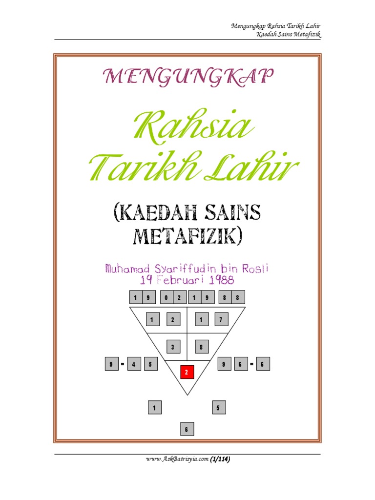 Pengiraan Metafizik Tarikh Lahir Sebenarnya Dipanggil NumerologiPernomboran. Nombor yang terhasil adalah 2. Tanggal lahir tersebut secara tidak langsung akan mempengaruhi sifat dan karakter diri kita.