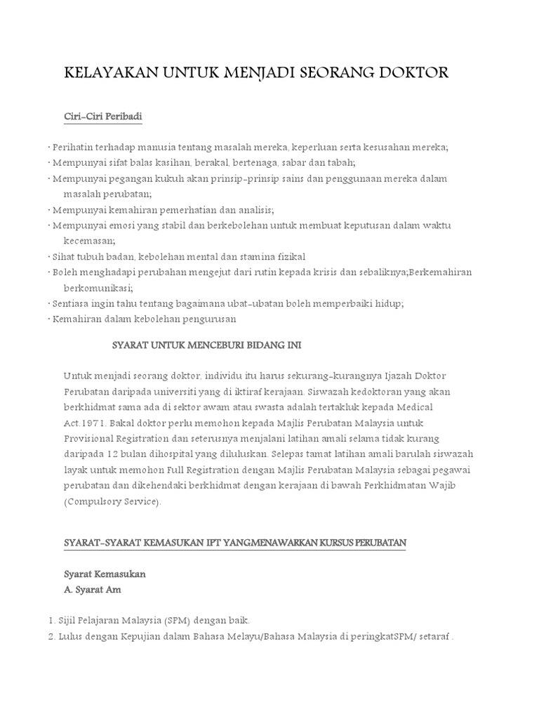 Klik pada judul artikel untuk memulai membaca. Sesetengah universiti ada yang menawarkan terus Asasi Perubatan seperti di UIA USIM dan lain-lain. Ciri-ciri yang anda perlu cari dalam diri seorang doktor.