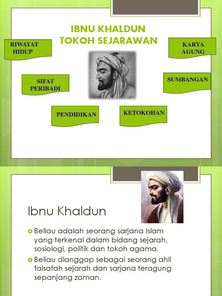 Riwayat hidup Ibnu Khaldun Jawatan-jawatan Ibnu Khaldun Sifat peribadi Ibnu Khaldun Pendidikan Ibnu Khaldun Karya agung Ibnu Khaldun Panduan sejarawan oleh Ibnu Khaldun Kandungan kitab muqaddimah Ibnu Khaldun Karya agung Ibnu Khaldun Ibnu khaldun tokoh pelbagai bidang Sumbangan Ibnu. 1 Sumbangan ibnu khaldun dalam bidang ilmu dan pemikiran yang amat bernilai kepada tamadun manusia. Kini ia merupakan ibu kota Hafsid salah satu pecahan daripada.