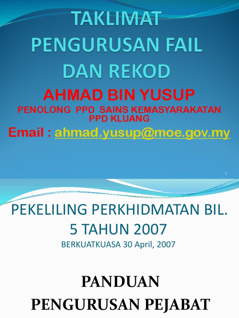 Kenyataan Perkhidmatan a Nama b Tarikh lahir c Tarikh lantikan pertama d Jawatan. Kita siapkan awal-awal dokumen yang diperlukan dan boleh terus berikan kepada Guru Besar. SISTEM PENGURUSAN FAIL 10 SEPATAH KATA Manual Sistem Fail ini disediakan dengan tujuan membantu pegawai dan kakitangan dalam perkhidmatan kerajaan didalam memastikan pengurusan rekod dilaksanakan dengan teratur dan efisien.
