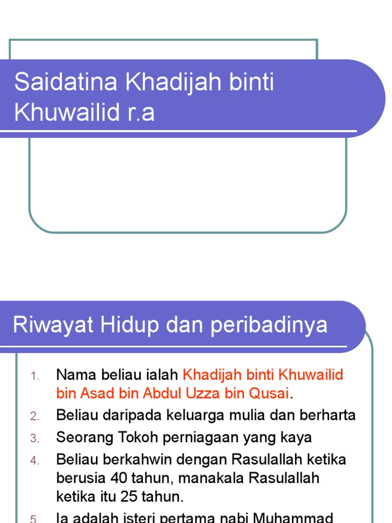 Siti Khadijah juga enggan duduk bersama wanita yang suka melakukan maksiat. Apabila wahyu sampai kepada Rasulullah Khadijah ialah insan pertama yang mengetahuinya. Sirah pel 29 unit 3 4 by tajuk.